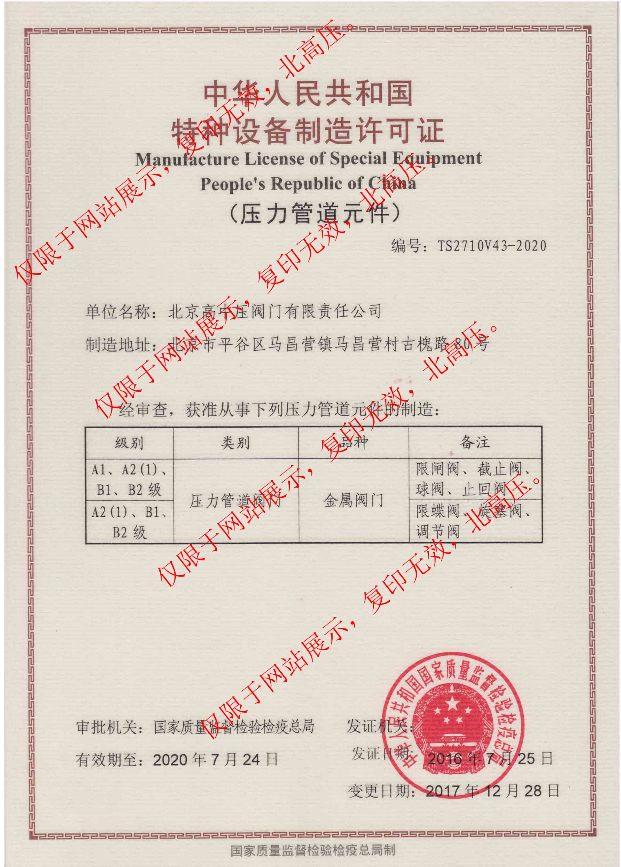 2017年12月28日,我司獲得中華人民共和國特種設(shè)備制造許可證(壓力管道元件)A1級證書資質(zhì)。