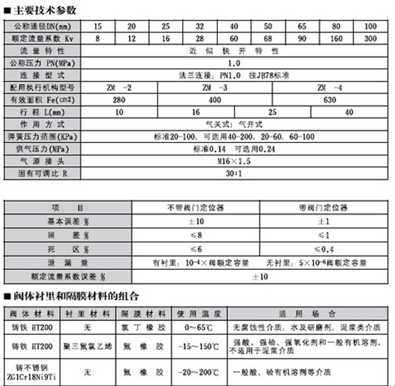 ZMA(B)T一10氣動(dòng)薄膜隔膜調(diào)節(jié)閥為無填料函結(jié)構(gòu)、節(jié)流元件為彈性隔膜,閥體流道平滑;閥體襯里和隔膜均可采用耐腐蝕材料制造,適用于控制各種腐蝕性和懸浮液介質(zhì)的調(diào)節(jié)場(chǎng)合